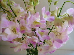 きのう、いつものようにスーパーに買い物に出かけましたが、いつもと反対側の出入口から(本当はこちらの方がメインの出入口なのですが、つい、家に近い帰り口の方から入店してしまうのです。)入店しようとしたところ、植物の鉢植えなどを置いてあるコーナーに<お買得>と書かれたデンファレを発見!私好みの淡いピンクが入ったデンファレの束が【380円】でありました。ホントにお買得!!最後のひと束で、少し傷みもありますがすぐに買い物かごに入れました。花を傷めない様に、大量の荷物は片手で持ち花だけは抱っこする格好で運びましたが、物凄いハードな道のりでした。嫌な感じの筋肉が付きそうです。家に付いて早々に生け替えましたが、7~8本は有りました長持ちして、我が家を明るくしてくれるとイイナと思います。