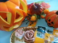 お店の飾りもハロウィーンムードからクリスマスモードへと、続々チェンジしてますね。カボチャ、可愛かったのに、ちょっと寂しいわと言う訳で、カボチャの置き物、撮ってみました。私の手作りの工芸砂糖と共にね。楽しんでくださいませ!昨日は帰りが遅くなってヘバってしまったので、紹介できませんでしたが、またうちに植物が増えました。置き場がないのに、どうするんだろ?とりあえず、無理無理おいています。ずっとこのままかもね<カラー/リップスティック>と、<カトレア/エンジェルソング・ララ>です。カラーは小型ですが、紫がかったピンクで、物凄く好きな色なので欲しかったものが、安く売っていました!カトレアも小型なタイプが、瀕死の感じでしたが安く投げ売り状態でしたので、ダメもとで購入!名前が可愛かったの早々に復活を祈り、植えかえました!何色のお花が咲くんでしょうね?当分は根や葉の成長のみを楽しみにしなきゃね。元気になれば、いつか咲くでしょう!前に根グサレした胡蝶蘭…・微妙に育ってはいますが、いぜん、元気な感じじゃありません・・・・カトレア買った園芸店に、見事な胡蝶蘭が有ったので、それを思い出し比べると、「うちに来ちゃって可愛そうね」と、声をかけづにはいられませんわ~。何か薬でもやらなきゃダメかしら?この間、ちょっと外に出しておいたら、すぐに葉焼けもしてしまいました・・・ゴメンホント難しいわ!みんなと元気に育ってね