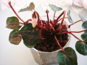 昨日は少し出来た庭の手入れ、今日は続きをやろうとしていましたが、郵便局やお買い物(買い出し)にいったので出来ませんでした~泣き!昨日手つかずにしたヤーコン、soraさんのブログを見たらもうすでに干しヤーコンまで作っていらっしゃったので、ぜひ掘りたかったわ~明日は頑張ってお庭の手入れが出来ると良いな。最近お気に入りの植物もご紹介したかったのに残念です。少し前に撮った写真を載せれるのでまあ良いか~(笑)これはシクラメンです。毎年のようにミニシクラメンを買いますが毎年枯らしている私って・・・・この子もすでに元気が無い気がしていますよトホホ