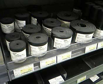 確かに…杉足場板を床材として使用する場合に気になるポイントです。板をそのまま並べていった場合、長さ方向の張り合わせ部分に段差がでる傾向があります。最大の理由は材料の厚みムラです。杉足場板はいわゆる製材品ですので、原木を大型の製材機で挽き割っただけの、極めて単純な素材です。製材品が故に、製材時の厚みムラが端部分に出る傾向があります。中心部は規格通り35mmなのに、端部が数ミリ厚かったりするものもあります。他の理由として、長年現場で酷使されるうちに、擦り切れて薄くなるものもあります。それと意外と多いのが、端部が暴れて部分的に床が浮き上がってしまっている場合です。木ネジ(ビス)でなく、意匠的に丸釘で施工する場合に起こりがちです。本来の足場板としての用途なら、さほど問題にならないのですが、床材としてそのまま並べると、部分的に発生するこの段差を何とかしたいということにもなる訳です。アジのある足場板だからこそ、このラフさもウリではありますが、キャスターがひっかかったりする程の段差でもあった場合は対策が必要です。我々の経験の範囲で、その解決策をご説明します。大前提として、板の浮き上りがないように、しっかり固定する。ポイントは、梱包を開いた順ではなく、事前に仮並べ(数枚並べて張る順番を決めていくやり方)して、色合いや風合いと共に厚みのムラの有無も確認していくことです。それでも、段差がある場合は・・・(1)部分的に高くなった板の裏面を削って調整する。 ・・・仕上がりの完成度からすると理想的ですが、手間がかかって現実的ではありません。(2)低い方の板の下に板ゴムを入れることにより、突き付け部分の段差を解消する。結果、幅方向(横隣)の板との段差を新たに発生する場合があるが、その場合は入れる板ゴムの厚みに変化をつけ、全体に面でなじませるように調整する。(言葉での説明は難しいですね・・・。) ※板ゴムは板のガタツキ防止にも使え、いろいろ重宝しますのでオススメです!昨日近所のホームセンターへ行って、こっそり携帯で写真とってきましたので参考にしてください。商品名:板ゴム素材:天然ゴムおすすめサイズ:◎幅5センチ×長さ1M(ロール状)写真左から → 263円/1mm 315円/2mm 368円/3mm 473円/5mm◎幅10センチ×長さ1M(ロール状) → 525円/1mm 630円/2mm 735円/3mm 945円/5mm※お近くのホームセンターにてお買い求めください。