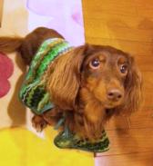 タオルの襟の部分は取り外しOKなので、カカオにつけてみました♪なかなかかわいい どう?似合う?…って、乱れちゃったね(^^;