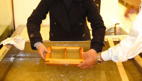 今日は渋谷に行ったのですが、用事と用事の間に少し間があったので、たまたまポスターを見た「石州和紙展」に立ち寄りました。場所は渋谷駅に隣接する、東急東横百貨店の南館8階です。石州和紙は古くから島根県ですかれている和紙です。原料は楮(こうぞ)、雁皮(がんぴ)、三椏(みつまた)。会場には小さいものから大きなものまで、たくさんの和紙が並べられています。素材の色をそのまま生かした素敵な和紙は、お値段もとても素敵でした。ちょっと買うことはできないので、目の保養をさせて頂いていると、会場の入り口では、紙漉き体験をすることもでき、年配の女性が紙を漉いていました。しばらく見ていたのですが、私もやってみたくなり、お願いして漉かせていただきました。はがき位の大きさの紙2枚分の枠で2回、計4枚分の紙を漉きました。原料と糊の入ったお水は、とろみがあります。そのとろみはに使われている糊は「とろろあおい」だそうです。とろろ…ってあのとろろ!?いえいえそうではなく、こんなきれいなお花の咲く植物です。漉いた後は水分をきり、しばらく乾燥。その間、紙漉の先生から石州和紙のお話をいろいろ伺いました。そして出来上がった和紙がこれです。見えにくいのですが、上の2枚に線が入ってしまったのは、手早くやらなかったからだそうです。それでも、出来上がった和紙に大満足です。ますます和紙が好きになってしまいそうです。今日は思いがけないところで、思いがけない体験をしてしまいました。人気blogランキングへブログランキングに参加しています。ワンクリック、よろしくお願いします!