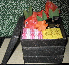 今週末行なわれた、ラッピング協会作品展の写真をアップいたします。テーマは「四季~The four seasons~」と言うことで、いろいろなフォーシーズンがありました。四季をそのまま表現された方、一つの季節にしぼって表現されたかた。私は後者で、お正月を自分なりにラッピングで表現してみました。タイトルは「賑やかに迎える春」です。お正月とは、ちょっとあまりにも季節外れ。背景に使用している唐草模様の和紙が、1年以上前から気になっていて、どうしても使ってみたかったんです。それに旧暦で言うと今はまだ師走。これから迎えるお正月に先駆けてのラッピング。ディスプレイに使用した小物は、今年のお正月の残り物。と~ってもお安くゲットしちゃいました!!残り物には福があるって言うことわざもあるし、何だか縁起がよさそうではないですか!我が家のおせちよりも豪華な、ラッピングおせち。尾頭付きの鯛は、タケノコ包みのアレンジです。お供え餅もみかんも本物です。この日までお餅にカビが生えないように、気使っちゃいました。裏白はフリーハンドで、チョキチョキ…紙切り職人は絶対なれそうもありませんね。見えにくいけど、組みひもの上に金紙で折ったエビちゃんが乗っています。黄金に輝く竹は、門松と言うより、かぐや姫と言う感じですね。「いろはがるた」です。犬とお団子は折紙です。と、まあ私は今回はこんな感じでしたが、出展者のみなさんの作品は、どれも力作ばかり。私ももう少し、時間と手間をかけて作りたかったと反省しながらも、次の作品展のテーマは何かと、今から楽しみです。最後に、案内状を差し上げて、見に来て下さった方々ありがとうございました。人気blogランキングへブログランキングに参加しています。ワンクリック、よろしくお願いします!