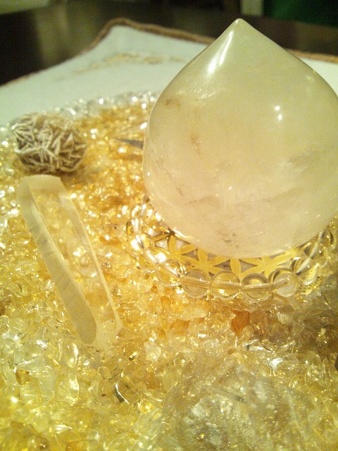●本日の鉱物遊び。主役はシトリン。こと葉です。本日の鉱物遊び。主役はシトリン(黄水晶)!元々好きなクリスタルの一つですが、最近出会いがあって、極小のさざれ(砂利)を入手したのです。重さ1kg!一目見てキュンとなり、でも迷って、最後にレジに持ち込んでしまいました。ちょうど同じタイミングで手に入れた「パワーストーンカード」というものがあり、それを使って初めてリーディングを試したところ、出てきたカードが「シトリンクオーツ~Daylight貴方を照らす光~」。未来を示すカードとして出てきてくれて、目的達成、社会的成功、堅実な財運、人気運、ポジティブ思考、自然体など、ガイドブックに載っていた暗示のキーワードもうれしくなる言葉ばかりでした。喜んで、早速ワクワクのシトリンタイム。まずはこれからの作家活動をテーマに、ハートのシトリンを制作しました♪自分に内在する力(パワー)を、私自身の高次元の利益のため、同時に平和と調和の世界のために使えるように。じゃりじゃりとクリスタルを触っているだけで、幸福な気分が広がります。第3チャクラに働きかける石なので、第3チャクラのヒーリングもしました。見ているだけで呼吸が変わり、金色のエネルギーが第3チャクラに飛び込んでくる感じです。 こんもり♪ 続いて、直感でつくったのがこちら。丸い球はホトケさんのブレスレットだったゴールデンルチルクオーツ(針水晶)。真ん中の六角柱もシトリンです。 クロス(十字架)になったからか、「キリスト」という言葉が浮かびました。内在する力(パワー)を、平和や奉仕のために使う、ということが浮かびました。ホトケさんから感想を聞いて、ふたりで作品のリーディングをするのも最近の夜の愉しみです。レイキとの併用が楽しい鉱物遊びブーム。しばらく続きそうです。愛と感謝を込めて。こと葉- - - - - - - - - - - - - - - - - - - - - - - - - - - - - - - - - - -発芽*レイキアカデミー主催の講座・集まりのご案内です!- - - - - - - - - - - - - - - - - - - - - - - - - - - - - - - - - - -■発芽したい人のレイキセミナー(どなたにもご参加いただけます)レイキを使って心や体を癒したい! 自分らしく夢を実現していきたい!一日でレイキが使えるようになる、当アカデミーのメインセミナーです。http://www.hatsuga-reiki.jp/category/1265966.html【東京】8月15日(金)、9月12日(金)、9月21日(日) 講師:福島麻由美、坂本かおり【大阪】8月30日(土)、9月6日(土)、9月13日(水) 講師:奥田みさよ、塩田美子、奥田裕之(土日のみ) ■感じるレイキ練習会&体験会(どなたにもご参加いただけます)レイキを体験&練習したい方、そして定期的な心身の浄化メンテナンスに☆他所伝授のヒーラーさんも大歓迎です。http://www.hatsuga-reiki.jp/category/1265967.html【東京】8月16日(土)講師:みやざわけいこ・よしだあゆみ【東京】9月18日(木)講師:矢尾こと葉・矢尾寛明【大阪】8月23日(土)講師:矢尾こと葉・矢尾寛明【大阪】8月27日(水)、9月9日(火) 講師:奥田みさよ、塩田美子、奥田裕之 (土日のみ) ■8月17日(日)東京:レイキの源からガイドにつながるセミナー【1day】2011年と2013年に行われた「大安心の境地へ☆ガイドと共に生きるクラス」を1dayセミナーに凝縮。大阪では今年3月に開催され、大好評を博しました。ガイド(霊的な守護存在)との交信を欠かさないよしだあゆみ講師が贈る、「ガイドとつながりを深め、共に生きていると言えるレベルにまで実感したい」と願うレイキヒーラーのための特別セミナーです。最大のポイントは、"レイキの源から"しっかりガイドとつながること。五感や超感覚を開く方法を丁寧に楽しくレクチャーします。http://www.hatsuga-reiki.jp/category/1589701.html【東京】8月17日(日) 講師:よしだあゆみ ■内なる美徳を呼び起こすワークショップ(どなたにもご参加いただけます)美徳を軸にした人格教育プログラム「ヴァーチューズ・プロジェクト」の公式ワークショップ(2日間)。自己肯定感が高まり、人間関係がとても楽になります!http://www.hatsuga-reiki.jp/category/1284561.html【東京】8月18日・19日(月火)、9月14日・15日(日・月祝)【大阪】10月25日・26日(土日) ファシリテーター:矢尾こと葉、矢尾寛明ほか ■創造性を高める☆アートワークの会(発アカ認定レイキヒーラー対象)アートワークで子どものような感性を開き、感情を開放し、創造性を高めましょう。妖精のようなみやざわ講師のナビゲートによる、インナーチャイルド大喜びの時間。1回完結、単発でのお申込みとなります。8月はパステルアート&おもしろいことを予定!http://www.hatsuga-reiki.jp/category/1580853.html【東京】8月21日(木)/14時~17時 ファシリテーター:みやざわけいこ ■大阪5期レイキヒーリングブラッシュアップクラス【8月~11月期】(発アカ認定レイキヒーラー対象)全4回。8月23日(土)、9月20日(土)、10月18日(土)、11月15日(土/了)10時30分~13時 ※ランチ懇親会 13時~14時テーマ:レイキで開運☆どこまでも!~全チャクラ大活性で幸せ度底上げの4カ月~メイン講師:矢尾こと葉・矢尾寛明詳細:http://www.hatsuga-reik
