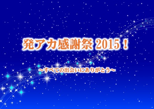 ●当日参加歓迎! 本日12/26発アカ感謝祭です!! こと葉です。発アカにご縁あるみなさま!本日は発アカ感謝祭2015です!!年末恒例のお楽しみ企画!! 急に予定が空いたから…。そんな「来ちゃった♪」参加、大歓迎です。当日につきメールでのご案内は送れませんが、発芽*レイキアカデミーの場所を知っている方なら大丈夫ですよね!JR中央線国立駅南口から徒歩2分、国立スタジオの階下、2階の商況さくらホールが会場です。 途中参加、途中抜け、大丈夫です。参加費3,000円。一品食べるものをお持ち寄り制♪以下がタイムスケジュールです!! <タイムスケジュール>12時30分 開場13時~(約1時間) 開始 こと葉とホトケ進行によるステージでのトーク企画14時~(約45分) 歓談1開始(食事と同時にセッションや物販も開始)14時45分(約30分) ステージにて舞と演奏15時15分(約15分) 歓談2開始(引き続き食事やセッションや物販)15時30分(約30分間)まゆかおオンステージ16時~(約30分) 歓談3(食事やセッションや物販はここまでです)16時30分(約30分) 地球ヒーリング(全員参加)17時 終了・片づけ18時30分~ カレー屋さんにて懇親会(実費3,500円)もう、明日が楽しみでなりません。今年一年の感謝を込めて、どーんとご提供します!!!何を?私の気づきを! そして体を張ったコスプレを!!(笑) こと葉
