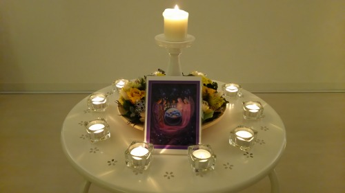 ●発アカ感謝祭2015報告(5) 地球ヒーリング こと葉です。会のラストは、全員参加の地球ヒーリング。 この会のためにつくられたアースサークルを囲んで、みんなで輪になって座ります。ホトケさんが集めてきたクリスタル(水晶)を六芒星に組んで。神聖幾何学に基づいたセッティングをすることで、ヒーリングの効果が何倍にもなります。 みんなのヒーリングや祈りの力を最大化するための場づくり。ホトケさんが得意とする分野です。 キャンドルにも火をつけて… 水晶とキャンドルのアースサークルが完成。 自然の精霊に扮したこと葉の誘導で、みんなで地球に愛を送るヒーリングをしました。 一つに溶け合うような、神聖なひととき。 レイキギターのKENさんがその場の即興演奏で、こと葉の誘導に合わせてメロディを奏でてくれました。 生演奏だったの~と後から驚いた人もいたくらい、心地よく美しいコラボレーションでした。 KENさんのエレキギターから発せられる音霊は、KENさんにしか弾けないやさしさにあふれています。 地球ヒーリング担当の3人。 最後にみんなでキャンドルの火を消すところ。 この時の写真、私が撮影したお気に入りの一枚です。 とはいえ、今回のイベントの功労者さんは、なんといっても*ゆき*ちゃん! 普段着ですよね?と言いたいくらいにお似合いの清楚なシスターコスチュームで、受付から写真撮影まで縦横無尽に活躍してくださいました☆ 初めて使う慣れないカメラだというのに、美しくてカッコいい写真がたくさん!腕とセンスに脱帽です! *ゆき*ちゃん、ありがとう!! 今回も体を張って(?)イベントを盛り上げてくれた、発アカ講師陣&Napuaちゃん! それぞれの持ち味があって、大好きなメンバーです。 おもしろい写真。 そして実は集合写真を撮り忘れていて、片づけの最中に思い出して撮った写真がこちら! ノリノリ~!!見れば見るほどイイ写真です。^^ 発アカファミリーのみなさん、本当にありがとうございます。 遠方からも途中から駆けつけてくださった方もいて、感激しました。全員で40名くらいでした☆ 光になった仲間のために、KENさんが深紅のバラを持ってきてくださって。見えない仲間の存在感も感じていました。 ホトケさんがオープニング動画でつくってくれたように “私たちは一人じゃない” たとえヒーリングをスクールで熱心に学ぶ時期が過ぎても、いつでもヒーラーさんたちが帰ってこられる港のような存在でありたいと私もホトケさんも願っています。 愛と感謝を込めて。 こと葉