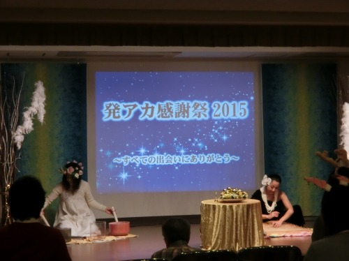 ●発アカ感謝祭2015報告(2) 歓談中前半のステージ♪ 引き続き写真です。 歓談タイムの途中のステージ。 クリスタルボウルの演奏家である風民(ふうみん)。大切なボウルたちを連れてきてくれました。含有されているミネラルなどの種類が違うので、クリスタルボウルはみな異なる音色が出ます。音が響き合い、心地いい時間です。 Napuaちゃんは、ご自身で彫ってつくった楽器タオライアーを奏でてくれました。初めての音色に魅了されました。天女の音色だわ~!! 夢のように美しい時間で、宇宙を感じたな~。ふたりの息もぴったり。 よしだあゆみさんが、応援しているアーティスト藤岡正明さんの「朝靄」を熱唱。 応援のエネルギーがいっぱいでした~!! Napuaちゃんが得意のフラで歌の世界を表現されたのも美しかったです♪ おふたりは「真姿の祈り」ユニット♪ 清らかなお三方です♪