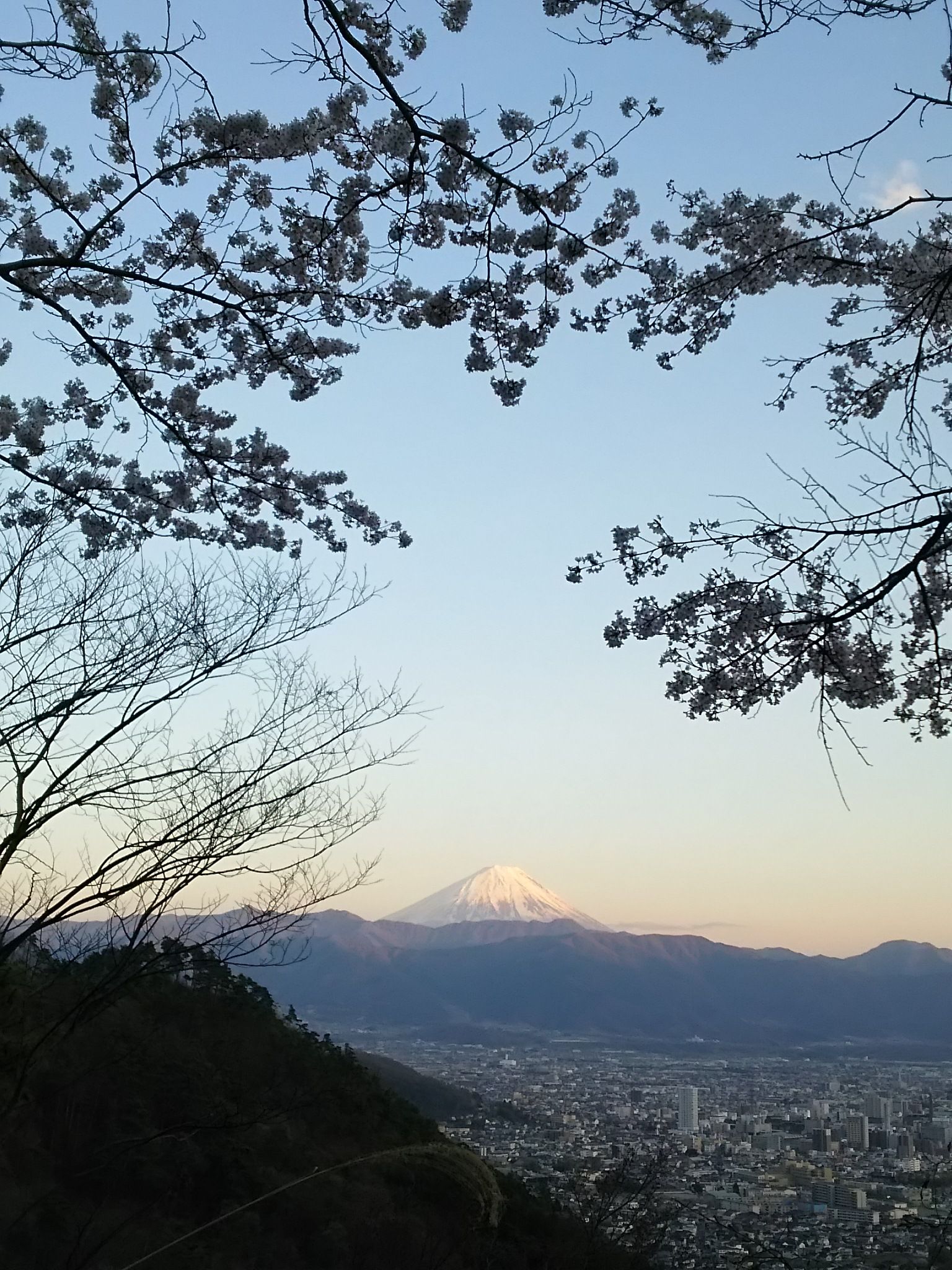 山梨の夕刻、桜の向こうに富士山を拝むことができました。