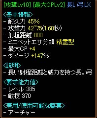 最近、あちゃの秘密デビュー目指しています。実は、あちゃでは秘密行ったことがないのです。(高Lv秘密実装時、あちゃはLv420くらいだったのでw)久しぶりの気合入れてのあちゃ狩り楽しいです^-^しかし、Lvなかなか上がんない^~^;あー、それと最近 弓を新調しました。このLvで装備出来る範囲では結構良い弓だと思います。DXU弓と比べると見劣りするけどね^-^;あとDXU能力修正で花の乙女のサークレットが随分ぱわーあっぷ^-^v修正前に格安で手に入れてました。(名前が、かわいかったから(*ノωノ)ポッ)あちゃと言えばスナテイが主流なのですが・・・一年前に通ってたデスピPTでもマシンあちゃは絶滅危惧種でしたwでもやっぱり私はマシンが好きです。デスピPTではマシンを下位スキルと馬鹿にするあちゃさんもいたのですが・・・マシンからタゲ取れるスナテイあちゃは、ほとんど居ませんでした。1~2人ほど攻速&パワーに優れたスナテイあちゃさんには負けましたけどね^-^;いやまぁマシンで貯まったCPでビット撃つとタゲ帰ってきたので引き分けと言う事にしましょw(*ノωノ)マシンでは攻速装備意味無いので全身ダメ&力比率装備で固める事が出来ます。すると、結構あなどれないパワーが出ます(o・`v´・)ダメ装備の恩恵でインターもビットもかなりパワー出せます。憧れの5000ビット(人´∀`)ソロ狩りでもHP吸収装備を織り交ぜればPot要らずでぇす(≧◇≦)♪狩場確保が厳しい昨今、ソロリストの私的にはPot補給無しは、かなり重宝します。(HP吸収出来る狩場に限定されますけどね^-^;)テンプレスナテイアチャに負けない最強マシンアチャ目指します(o・`v´・)9我が道を行くなのです(。-`ω´-)b~ おまけ ~やっとこさのメインクエ2完了記念w(あらぼんBisさん、ちょっとそこボスと被ってるぉw)メインクエ3・・・どうするかなぁ^-^;;;