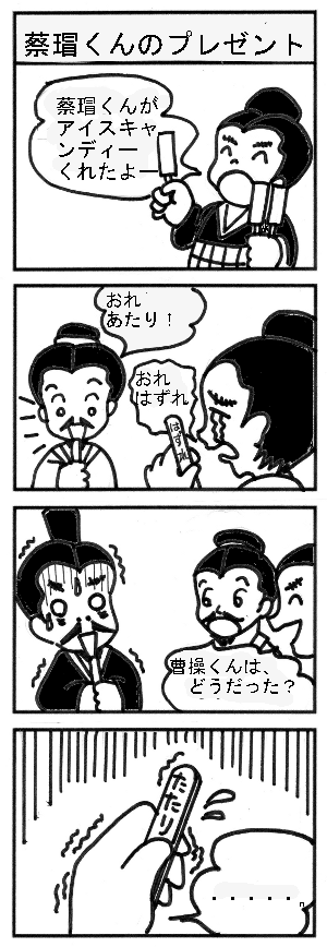 水軍の蔡瑁くんが、周瑜くんと孔明くんと曹操くんに、アイスキャンディーをくれました。
