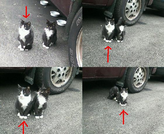 昨日彼の車購入の為にとある中古車ショップへ行きました。いろいろ見ていると、1台だけ売り物の車なのか物置代わりの車なのか分からないような古い車の下にいくつかのお皿が。。。車の下を覗いてみると。。。!か~わ~い~い~((▽\*)≡(*/▽))鼻の上の白い部分がちょっと違うだけでほとんど似た様な模様のニャンコ2ニャン発見!!人間の双子同様仕草が凄く似てるんですよね。でもそのうち片方は懸命にグルーミングをしだしてこっちには全く興味ナシ。でももう片方のコがジッとこちらを見て興味津々といった感じ。携帯カメラを向けると必ずこちらを見てくれるんです。赤い矢印を付けたコ。。。きちんとお座りして、さもどこから撮ってくれても結構よ、と言ったいでたち。着かず離れずで一定の距離を置いて人間を観察している様子。その内飽きたのか2人してどこかに去ってしまいました。何枚も同じような写真を撮り過ぎて彼氏に怒られましたが、本当に可愛かったです(〃∇〃) なんというか。。。うちのゆきちゃんと違ってシャープでクールな感じ。写真では分かりにくいけど、結構まだ小さいみたい。ちゃんとたくましく生きて行ってネ☆