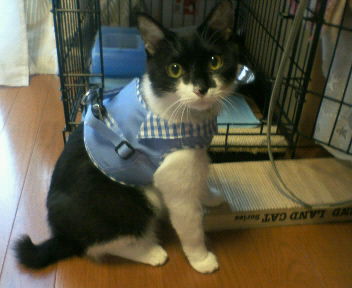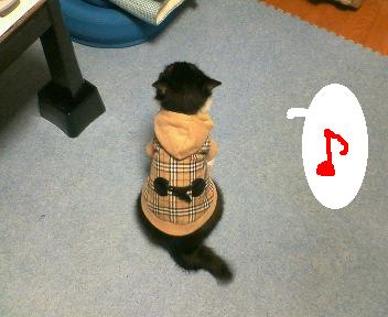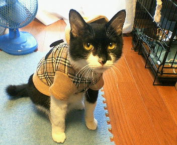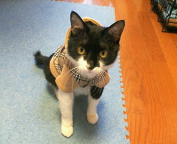 本当はワンちゃん用のお洋服なんだけど、バーバリー調のお洋服だったので思わず購入。なんとかギリギリ入りそうかな?って思ってたけど、実際着せたらぴったり!着せる時は最初イヤイヤしてたけど、着せると大人しくなっちゃった( ̄▽ ̄;)アレ。。。意外にも好き?それともあんまり着慣れてないから?『ナニすんのよっ』すごく睨みを効かせてます(¬_¬;)『あら、あたちに似合ってるじゃな~い?』でもその内慣れてきたのかな??きゃわゆ~い♪ちょっと前までは動物に洋服なんて可哀想!なんて思ってたのに。。。最近では写真くらいなら。。。って感じでいいのがあれば買ってます。もちろんグルーミングをするニャンコには長時間着せられないので、写真を撮ったらすぐ脱がせましたけど。ワンちゃんの場合は、ご主人が喜んでくれるのであまり嫌がらないって説もあるみたいだけど。。。やっぱり長時間はダメですよ(^_^;)今度は天気のイイ日にこのお洋服着せてお散歩しようかなぁ~♪