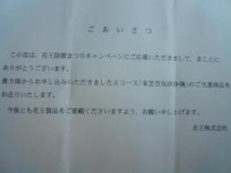 家電?!当選☆「花王除菌まつりキャンペーン」当選A賞・・・『東芝空気清浄機』☆☆☆ 出せばいつかは当たるものなんですね~~~。これは、実家の住所で応募したものが当選しました。16畳用なので、リビングサイズかな。5年前くらいに旦那が購入したものがあったので、交換しようかなぁ~~って思っていたのだけれど・・・実家に届いたもので母:「N(私)の家には、あったよね。お母さん欲しいなぁ~~」って言われちゃいました。まぁ・・・親孝行って事で。少し懸賞のモチベーションが落ちていたので、再浮上中(笑)