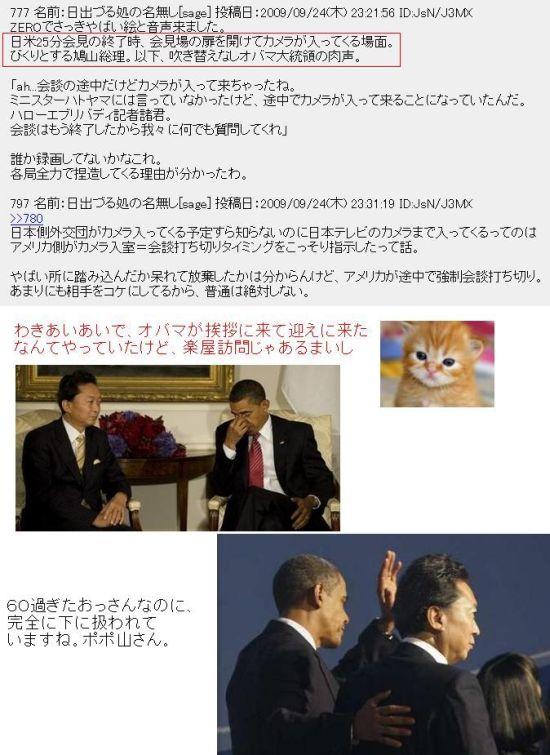 この部分はあくまで個人的な趣味ですので、お気に触ったら申し訳ありませんが・・・ちょっと転載します。すると、別に目が泳いでいるかどうかは知りませんが、ちゃんと動画うpされておりました。それから、各国首脳夫妻そろい踏み、鳩山首相はHugされていないのを発見。哀しい・・・あと、どこだっけ?握手のあと、ズボンで握手した手をゴシゴシ、子供じみたことしてるとこを見た・・・前首相とは格が違いすぎ!これはホント?ちなみに会談も含め比較して申しますと、麻生前総理がサミットで外交デビューの時は、ブッシュジュニア「第1回G20金融サミット、世界最初の発言者は首脳会議初参加のこの男! 世界各国首脳には既におなじみのルーキー!タロー・アソーから始めよう!」ですよ。まあ、総理になる前に外相としてライス姉さんに会ったら「タロー!」と抱きつかれるレベルまで 顔を売ってたから、比べるのはさすがに可哀想かも知れませんが、現実はこのように天と地ほどの差があります。ちなみについでに言っておきますと、オバマ大統領主催晩餐会では、ルーキーだからと100人以上いる席で夫妻そろってすみっこの席に座らさせられていたそうですwマスコミの持ち上げぶりは異常では???詳しい写真、動画はこちらにありますとてつもない日本