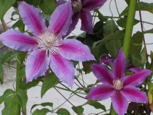 今日は朝から曇り空でそよ風があり夜中に雨が降った事もあり気温も少し低く過ごし易いです。昨夜の雨で庭に充分水分が含まれているので草取りもスムーズに出来ました。雨の滴が残るクレマチス雨に似合うアジサイ