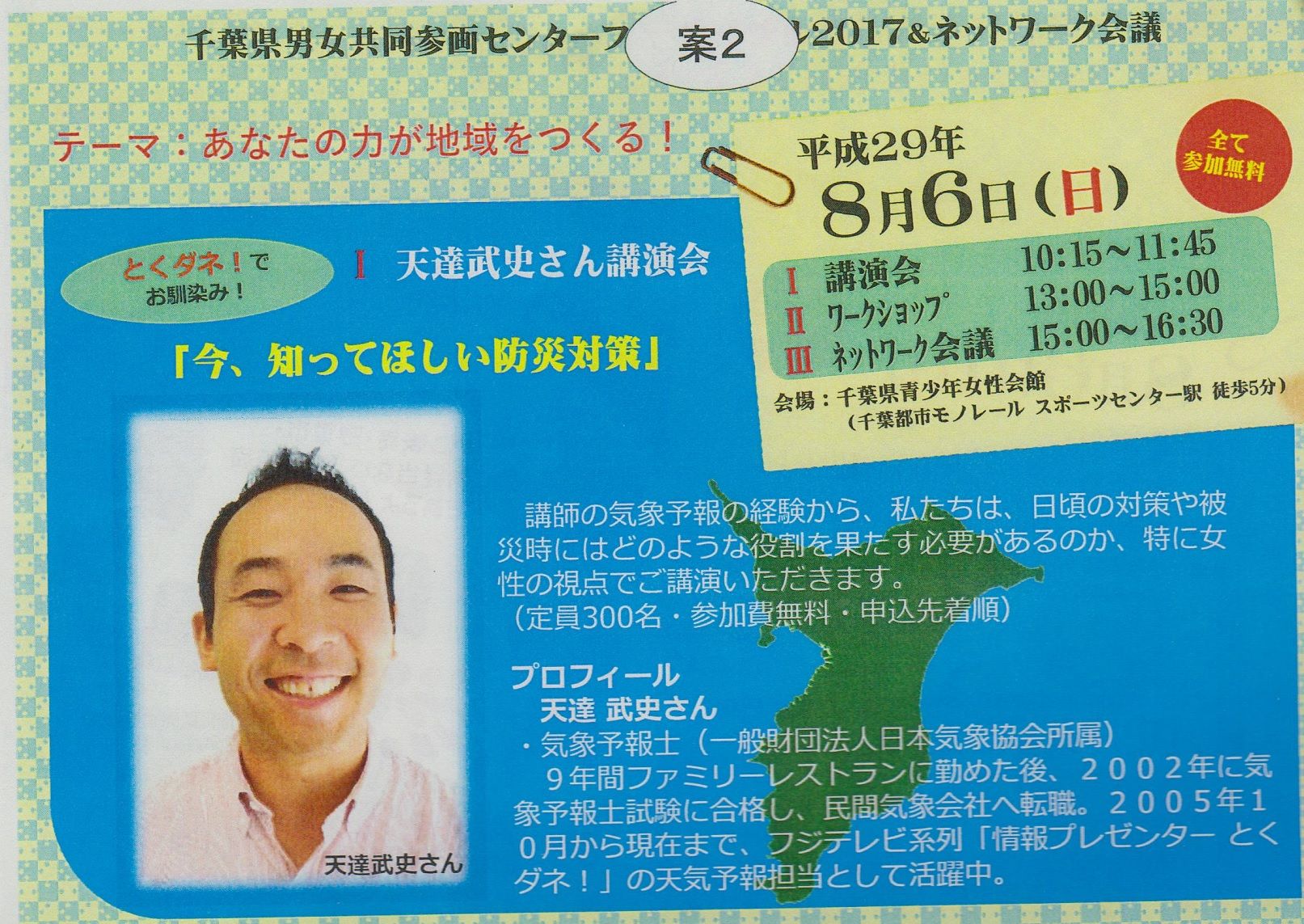 今年8月6日に千葉県男女共同参画センターフェスティバルがありその企画運営委員会がありました昨年はその企画運営委員長をしていました今年も事務局から委員長の打診がありましたが皆さんからの推薦ならばとしていました今年は気象予報士の天達武史さんの講演で、防災に関するものとなります昨年も委員だった方の推薦もあり、委員長になりました会議をさっさと仕切って、30分程度早めに終えました今後も頑張りたいと思います