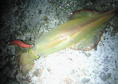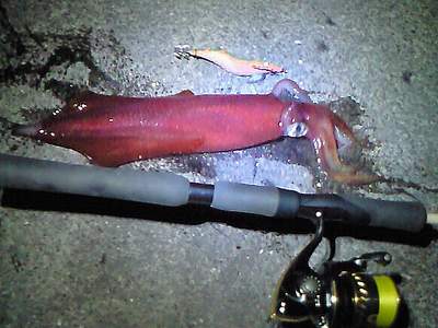 眠い目擦りながら、今回は後輩と一緒に行ってきました。今回は、そろそろイイかも(^-^)と言われている東地区。僕の中でここぞと思われる4カ所の様子を見てきたんですが・・・暗いうちに第一チェックポイント。暗くて潮色はわかりませんでしたが、ちょっとゴミが気になるところ。後輩と二手に分かれて、チェックスタート。僕は難無く数頭目でとりあえず本命Get(^-^)餌木猿/NINJA赤影 23cm 620gしかし、その後は・・・明るくなって、後輩の居るところへ行って状況を聞くと推定キロクラスをバラしたと・・・(;゜〇゜)で、アカイカ×1。2人でシャクってると後輩のロッドが曲がってます。上がってきたのは、キロちょっと欠けるぐらいの本命。(家に帰って測ったら1200gあったそうです(^^;)居ますねぇ~(^-^)しばらくして、今度は僕に♪餌木猿/松SPピンクカナブン 26cm 900gサイズの割にめっちゃメタボなメスでした(^^;ここでモンスペギャフの墨付け完了♪その後、移動して仮眠。汗だくで起きて、2ラウンド目スタート。ここもこの時期気になって・・・って、ゲソ×2で終了(>