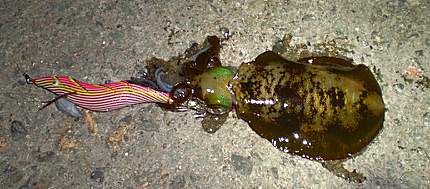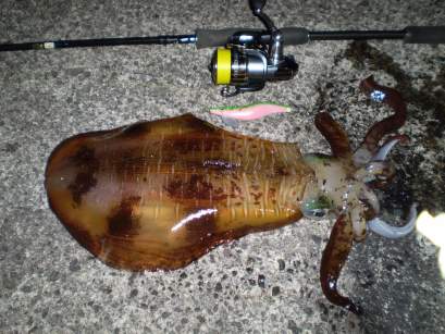 昨年中は皆さんにいろいろお世話になりました。2009年、今年もよろしくお願いします 2009年初シャクリに逝ってきました今回は年に一度、一緒に釣りに行く釣友satoさんと一緒です。行きのの中は、久しぶりに会うsatoさんとワイワイガヤガヤあっと言う間に到着です4時半スタート。風もそれほど強くなく、うねり少々とまずまずのコンディション。でも、えらい寒くなりましたインナーダウンに、ホカロン貼って頑張りますしばらくすると、堤防先端の潮目が目につきそれが気になってプチ移動その1投目にこの子がご挨拶に来てくれました松SP/ピンク×赤テープしかしこれも単発で・・・またプチ移動ボトムにロングステイさせていたエギに違和感そのままあわせてグイ~ングイ~ンやっとキーパーサイズです23cm 560g 松SP/ピンク×マーブルsatoさんは暗い中での釣りに慣れてないらしく何やってるかわからないと(笑)それでも頑張って、良型ケンサキをゲットそしてコロッケ1杯追加その後しばらく頑張るも・・・シーーーーーーンそれではサーフにも逝ってみましょうかと、移動します途中、いくつかのサーフをチェックするも何処も今一とあるサーフ2カ所を叩くも、何事もなく撃沈ヒラメから「チミにはまだ早いよ」と言われてるようでしたしかし天気も良く、ウエーダーなんて履いてたらもう汗だくですわその後、satoさんの車で2人で爆睡お昼過ぎに起きて、更に南下して某所堤防。釣り人大量ですから~数カ所見て回るも、結局夕まずめは最初のポイントで。ちょっと早めに到着して場所確保それでも暗くなるまで異常なし。そんな時、satoさんにヒット400gぐらいでしょうかね2009年伊豆のアオリにニンマリですその後僕にも松SP/緑×赤テープさぁこれからと言うときに、急に釣り場が混んできてあっと言う間に満員御礼テトラにも10人ぐらい入って来ちゃって僕のラインが隣の人と絡んでテンションダウン・・・それでは最後にメバリましょうと移動・・・前回と同じくネンブツダイの猛攻で終了(苦笑)新年早々、アオリが釣れただけで良かったぁ~去年ホゲッてましたから上等ですねまた今年も頑張るぞぉ~