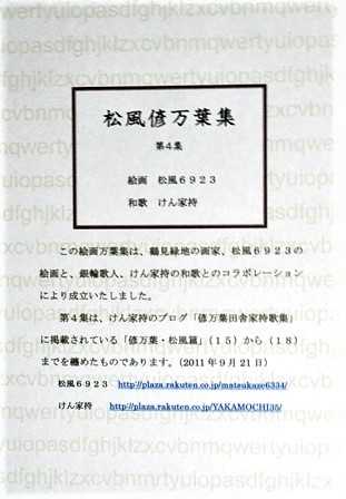 松風偐万葉集第4集が完成いたしました。 近日中に「河内温泉大学図書館」に収蔵され一般公開されることとなりますので、興味ある方はどうぞご覧になって下さい。 松風さんのブログは今年の6月半ばからコメント欄が閉鎖されましたので、偐家持の歌を贈ることも叶わなくなりました。よって、偐万葉・松風篇は(その18)を以って、また松風偐万葉集はこの第4集を以って完結といたします。(松風偐万葉集第4集の表紙)<参考>偐万葉・松風篇(1~18)はコチラからご覧戴けます。 松風さんのブログはコチラからご覧戴けます。 河内温泉大学図書館はコチラから入館できます。 関連記事:松風偐万葉集 2011.2.11. 松風偐万葉集 第1集 第2集 第3集 第4集 <追記・注>写真が横倒しになった歪んだ画像になってしまっていたので、2020年10月29日これを復元修正しました。●過去記事の写真が歪んでいたりすること 2020.10.12.