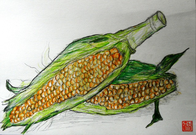 第87回智麻呂絵画展 智麻呂絵画ファンの皆さま、お待たせいたしました。昨日(17日)雨の間をぬって、智麻呂邸を訪問。新作を仕入れて参りましたので、今日は第87回智麻呂絵画展の開催であります。 どうぞごゆるりとご覧下さいませ。 <参考>他の智麻呂絵画展は下記から。 第1回展~第100回展 第101回展~第200回展 第201回展~(トウモロコシ) トウモロコシは第63回展以来の登場です。今回も前作同様なかなか力強い絵になりました。 <参考:第63回展> 寄り集いおしくらのごと黒葡萄 (凡鬼) これは、昨年9月の「凡鬼俳句便り」にあった凡鬼さんの句の一つでありますが、黒葡萄ならぬこのトウモロコシもかなり「おしくらのごと」であります。 我々は子供の頃はこれを「なんば」と呼んでいたが、今はこの言葉を使う人は見掛けませぬ。で、ネット検索してみたら、実に多くの呼び名のあることが分りました。(下記) あぶりき、いぼきび、うらんだふいん、かしきび、きび、きみ、ぎょく、 ぐしんとーじん、こうらい、こうらいきび、こーりゃん、さつまきび、 さんかく、せーたかきび、たかきび、とうきび、とうきみ、とうたかきび、 とうとこ、とうなわ、とうまめ、とうみぎ、とうむぎ、とうもろこし、 とっきび、なきぎん、なんば、なんばと、なんばん、はちぼく、 ふくろきび、まごじょ、まめきび、まるきび、まんまん、もろこし、 やまととーんちん、嫁女黍(よめじょきび)(バッグ) このバッグも菓子舗「千鳥屋」のお菓子の詰め合わせが入れられていたバッグですが、第62回展に似たようなバッグが登場しています。今回のバッグのそれも、先日訪問の際のけん家持の手土産でありましたが、またしても絵になっていた次第。絵の細部については、例によって恒郎女様からは、クレームがついて居りましたが、さて、それはどの部分でしょう? しかし、智麻呂氏は、やはり柳に風にて、 「ネコヤナギなのだ。」 いや間違えました。 「これでいいのだ。」 でありました(笑)。 <参考:第62回展>(冬瓜) 上のトウガンも下のゼフィランサス(玉簾)も、当ブログの以前の記事(「台風の雨の間の墓参・花散歩」2011.9.3.)に掲載の写真から起こされた絵であります。 当然のことながら、どちらも写真では出せない温かな味わいを醸していて、なかなかにいい絵であります。(ゼフィランサス<玉簾・レインリリー>)(ベゴニア) ベゴニアは一番新しい絵だろうと思います。昨日(17日)、智麻呂邸では、この花の鉢植えがテーブルにあって、この絵さながらに咲いていました。 この「ベゴニア」という名が小生も恒郎女様もなかなか出て来ず、テーブルの上のこの花の鉢植えを間に挟んで、「あれ、あれ、・・」などともどかしがっていたのでありましたが、智麻呂邸をお暇してMTBで走り出した途端に突如「ベ・ゴ・ニ・ア」と浮かんで来たのでありました。おそらく恒郎女様もお台所で夕飯の支度に取りかかるなどされた途端に「べ・ゴ・ニ・ア」と呟いて居られたのではないかと想像しています(笑)。(花瓶) これは智麻呂邸のピアノの上に置いてある花瓶ですな。本日は花が生けられてはいませんでしたので、この絵の通りでありました。(葡萄のカップ) このカップはカップなのかグラスなのか、材質がガラスなのか陶磁なのかは不明でありますので、よくは分りません。智麻呂氏がデイサービスで描かれたものであります。施設では智麻呂氏のために、写生の題材を適宜このようにご用意して、智麻呂氏の前に置いて下さっているようであります。