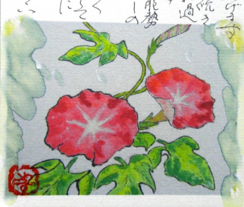 暑中お見舞い申し上げます。 毎日暑い日が続いて居ります。 どうぞ、皆さまご自愛下さり、ご健勝にお過ごし下さいませ。 銀輪散歩から帰宅すると朝顔の「暑中見舞い」が届いていました。 差出人は能勢泰麻呂こと山◎氏であります。 小生が現役であった頃、何かとお世話になったお方である。「これと言った趣味も無く・・時間潰しに朝顔を画いてみました。」と文面にはあったが、これだけ画ければ立派なもの、いいご趣味ではないかと思う。(能勢泰麻呂画・朝顔) 万葉集の「朝顔(朝貌、安佐我保)」は桔梗のことというのが定説のようですが、ムクゲ、アサガオ、ヒルガオ説もあって、何とも分らないというのが実の処だろうと思います。朝に咲く顔花を「朝顔」と呼んだのであってみれば、特定の花に限定しているのではないのかも知れません。万葉人には品種なんぞという植物分類学上の概念はないのであるから、現代の我々が「花の名」としているものとは違った範疇で「花の名」はあったのかも知れず、無理に今我々が呼んでいるやり方で「この花」と特定することは意味のないことであるのかも知れない。朝顔は 朝露負ひて 咲くといへど 夕影にこそ 咲きまさりけれ (万葉集巻10-2104)言に出でて 言はばゆゆしみ 朝顔の 穂には咲き出ぬ 恋もするかも (万葉集巻10-2275)