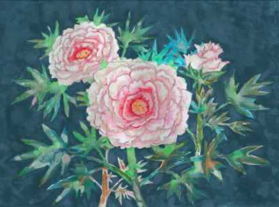 やはらかき 風吹きゆける 夕暮れに 牡丹の花の 咲きてありけり この歌は偐家持が2008年4月30日の日記を書くに当って作った歌である。花園中央公園の夕暮れに咲いていた牡丹の写真に添えたものである。 作った本人もこの歌のことは忘れていたのであるが(作った歌はもう6000首を超えているだろうから、記憶している方がおかしいのである。多くの歌は作った後(しり)から忘れてゆく・・というのが偐家持のあり様なのである。)、ブロ友の真澄さんのブログで本日お目にかかる羽目になった。 それも、素敵な牡丹の絵を添えて下さっている。 最初は真澄さんがお作りになった歌かと思ったのでしたが、小生の歌を当日記から引用戴いたものであることに間もなく気付きました(笑)。 この豪華過ぎる花は万葉歌には似合わない気がする。 勿論、万葉には登場しない。 だからと言う訳でもないが、その豪華さゆゑに、そして堂々としたその花姿ゆゑに、ヤカモチとしては余り好みではない花なのではある。 しかし、そういう花も夕暮れのかそけき風の中に置くときには、何やら可憐な様もほの見えて、珍しく牡丹の花を歌に詠んだのであったのだろうと思う。 そんな感じを表現していなくもない真澄さんの絵であると見るのは我田引水でありますかな(笑)。ともかくも、その牡丹の絵、茲にご紹介申し上げます。 先日の無患子(むくろじ)の木に続くコラボでありますな(笑)。 (牡丹:真澄氏画)<参考>真澄氏のブログ、2013年4月27日の記事参照 偐万葉田舎家持歌集、2008年4月30日の記事参照