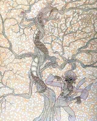 昨日4月19日の真澄さんのブログ記事を拝見すると、小生が先日ブログアップしたムクロジの木の写真を、素晴らしい絵に仕上げて居られましたので、ご紹介申し上げます。 小生作のムクドリの戯れ歌も掲載いただいて居りますが、絵の方は、ムクドリではなく、巨木に龍が絡み付いているという幻想的なものでありました。 枝を四方に広げつつ身をねじるようにして上空へと伸び上がろうとするムクロジの巨木は、真澄さんの感性では龍の姿にも見えたのでありましょう。 幻想的で存在感のある絵となった、小生撮影の木の写真。それは単に真澄さんの心のうちに既に存在した風景が絵画作品となって現出する上でのキッカケを与えたものに過ぎないのでしょうが、小生にとっては、何やらとても愉快で嬉しい気分になる出来事でありました(笑)。 <参考> 当ブログの記事「ムクロジ(無患子)・銀輪花散歩」 2013.4.13. 真澄さんのブログ記事「無患子」 2013.4.19.(「無患子」真澄氏画)無患子(むくろじ)は 龍ともならし 黄金(くがね)の実 さはにぞつけて 大空めざす (偐家持)幾代経(ふ)や 神(かむ)からならし 無患子(むくろじ)の 実の照る下の 愛(は)しき兒(こ)やたれ (偐家持) 真澄さんの絵にコラボしてみました。 言わばこれは、偐万葉・真澄篇の特別編でありますな(笑)。 (「流されたボールのある風景」真澄氏画)荒子川(あらこがは) 波立つ見ゆる 桜花 春日(はるひ)撥ねつつ 今かも散れる (偐家持) <参考>偐万葉・真澄篇はコチラからご覧下さい。