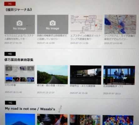 昨日、7月15日のアクセス数が2817件と急増しました。 それ以前の5日間は624件~1330件(平均951.4件)でしたから、いきなりの急増であります。 今日7月16日は朝10時半前後で2338件に達して居り、既に昨日のアクセス数を上回っています。 これまでの一日当たりアクセス数の最多は昨年6月21日の4047件でありますが、今日はこれを上回る新記録となるのかどうか。 久々の多数のアクセス数となったので、その他ジャンルに分類されている中でのブログランキングをチェックしてみると、何と5位になっていました。(2025年7月16日その他ジャンルブログランキング) ベスト5にランクされると、直近の記事だけでなく、直近4件の記事が紹介されることになっている。 ここ数日は100位以内というのが続いているが、通常は100位台とか200位台ということであるので、これは、まさに7月の珍事と言うほかありません。 ベスト10に入ったのは過去に一度あり、2023年4月7日が7位。過去最多の2023年6月21日については記録が残っていませんので詳細は不明ですが、10位台か20位台程度であったのでしょう。 何にしてもベスト5入りというのは、そうあることではないですから、おめでたいことであります(笑)。 当ブログは、どのジャンルにも登録していないので、「その他」というジャンル・グループとなり、5位というのはそのジャンルグループ内でのランキング順位ということになります。 では全ジャンルひっくるめての、つまり、楽天ブログ全体でのランキングはどうか、としらべてみると、44位ということでした。(2025年7月16日全ジャンルブログランキング)<参考>当ブログの歩み過去記事一覧はコチラ。