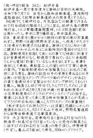 昨日(7/17)のアクセス数は910件。 前日の3915件から急減しました。 ブログランキングは前日のアクセス数に基づいて当日の順位を決定しているようですから、本日(7/18)の「その他ジャンルブログランキング」順は83位となり、昨日(7/17)の4位から急落。 ここに、7月16日・17日、2日間にわたる珍事は終了しました。 本日のアクセス数も、ほぼ昨日並みのようですから、珍事の復活はないと見込まれます。 よって、ほぼ正常というか通常というか、平常・平穏・日常状態に復しましたので、記事の方も通常状態に戻します(笑)。 即ち、本日の記事は、「岬麻呂旅便り」であります。●旅・岬巡り報告343・紀伊半島●添付写真(その1・7月7日)(その2・7月8日<1>&<2>) (その2・7月8日<3>)(その3・7月9日) 今回は7月7日~9日、青岸渡寺と瀞峡を目的に2泊3日紀伊半島一周というご夫婦旅であります。7月7日自宅→阪和自動車道・湯浅御坊道路→紀勢自動車道→周参見→R42南下→潮岬灯台→紀伊大島・樫野埼灯台→トルコ軍艦遭難慰霊碑・トルコ記念館→串本・橋杭岩→串本温泉(泊) ご自宅を愛車で出発、紀勢自動車道終点の周参見から国道42号を南下して、先ず潮岬灯台へ。(潮岬灯台)<参考>潮岬灯台・Wikipedia 外気温36度の猛暑の中、汗まみれになりながら、68段もある灯台の階段を登られたとのことです。お元気でなによりです(笑)。 奥様も登られたのでしょうか。(樫野埼灯台)<参考>樫野埼灯台・Wikipedia 樫野埼灯台というのは初耳ですが、紀伊大島の東端断崖の樫野崎にあるのですね。 オスマン帝国(現トルコ)の軍艦エルトゥ-ルル号遭難事件のことは聞き知っていましたが、漠然とした知識で正確なものではなく、この遭難事件が樫野崎の海岸沿いで起こったものであるということは、今回初めて知りましたので、勉強になりました。(トルコ軍艦遭難慰霊碑)<参考>エルトゥールル号遭難事件・Wikipedia トルコ軍艦遭難慰霊碑・串本町 (トルコ記念館)<参考>トルコ記念館・南紀串本観光ガイド トルコと言うと、ヤカモチは、トルコ建国の父とされるケマル・パシャ(ケマル・アタテュルク)という名が先ず思い浮かぶのであるが、これは多分、高校での世界史の授業で覚えた知識なんだろう。 このケマル・パシャの像が樫野埼灯台のすぐ近くにあるということも今回初めて知りました。(追記:2025年8月2日) 岬麻呂氏より追加でケマル・パシャの像の写真が送られて来ていましたので、追加で掲載させていただきます。(ケマル・パシャの像)(同上) まあ、何にしても、♪ここは串本、向かいは大島・・という歌は知っているものの、串本を訪ねたことのないヤカモチであるから、仕方ありません。<参考>ムスタファ・ケマル・アタテュルク・Wikipedia(橋杭岩) これは、有名な橋杭岩ですね。 しかし、ヤカモチはというと、手前に写っているハマユウの花に目が向かってしまいます。 そして、柿本人麻呂のこの歌が思い浮かぶという次第。み熊野の 浦の浜木綿 百重なす 心は思へど ただに逢はぬかも (柿本人麻呂 万葉集巻4-496) ヤカモチも追和して1首詠んでみます。串本の 橋杭岩の 継ぎ継ぎに 思へや妹が 夢にし見ゆる (吹芡家持)(本歌)真野の浦の 淀の継橋 心ゆも 思へや妹が 夢にし見ゆる (吹芡刀自 万葉集巻4-490)7月8日青岸渡寺→熊野川遡上→熊野本宮大社→瀞峡→かわせみ川舟乗船→R311→丸山千枚田→熊野尾鷲道路→紀勢道路→志摩温泉(泊) この日、岬麻呂ご夫妻は、先ず、青岸渡寺、那智の大滝へと向かわれました。(青岸渡寺三重塔と那智の瀧) このアングル、塔と滝のツーショットは定番のショットですね。 ヤカモチが熊野に旅行したのは18年も前の事になりますが、同じアングルで景色を眺めたことが思い出されます。 この時に詠んだ歌の一つが、あぢさゐの 色なまめかし 花越しに 霧立ち昇る 那智の山々というものでしたが、俳句をよくする友人の凡鬼さんからいい歌だとお褒めに与かった記憶があります(笑)。(青岸渡寺本堂)(熊野本宮大社)(同上・八咫烏のポスト) 八咫烏の郵便ポストは初めて見ますが、那智の瀧も青岸渡寺も熊野本宮大社も懐かしいことです。(熊野本宮大社<正面写真>) さて、ご夫妻は熊野本宮大社をアトにされ、瀞峡へと向かわれますが、その前に、「かわせみ川舟」にお電話されて、出船時刻をご照会されたとのこと。すると、13時30分出船につき、瀞郵便局を目指して来いとの回答。 瀞郵便局には正午前に到着。乗船前に昼食を済ませるべく、郵便局で昼食のできる店を尋ねて居られたところへ、川舟船頭さんから電話が入り、「到着されているなら、スグにも舟を出します。」とのこと。 そんな成り行きで、昼食は後回しにして、乗船されることに。 お陰でご夫妻二人っきりの貸し切り状態で乗船、丁寧に瀞峡の案内をしていただけたとのことです。(瀞峡・戸田乗船場)<参考>瀞峡・Wikipedia(瀞峡・下流方向)(同上・山彦橋) いささか高所恐怖症の気味もないではないヤカモチ、この橋を渡るのは御免蒙りたいですな(笑)。(岸壁に咲くサツキ