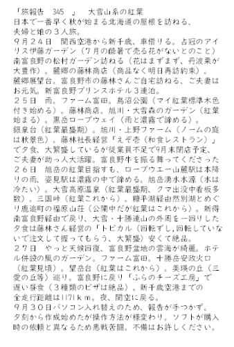 友人・岬麻呂氏からの旅便りです。 今回は、「日本で一番早く秋が始まる北海道の屋根を訪ねる、夫婦と娘の三人旅」(岬麻呂氏)とのことであります。 毎年のことですが、岬麻呂氏の紅葉の旅はこの大雪山・旭岳の紅葉から始まります。(旅報告345・大雪山系の紅葉)〇旅報告345添付写真 1.大雪山系・銀泉台、赤岳の東斜面 2.大雪高原3.十勝岳安政火口、十勝岳温泉9月24日関西空港→新千歳空港→(レンタカー)→占冠・アイリス伊藤ガーデン→南富良野・松村ガーデン→麓郷・藤林商店→麓郷展望台→富良野市・藤林邸訪問→新富良野プリンスホテル(3連泊) 新千歳空港からレンタカーで向かわれたのは、占冠のアイリス伊藤ガーデン。この夏、7月が酷暑であったため売る花がないとのこと。南富良野の松村ガーデンでは、花はまずまずであったが栗が大豊作であったとか。とのこと。ようです。 そして、麓郷の藤林商店。ヤカモチへの病気見舞いにと送って下さったメロンは、この藤林商店からのものでありました。しかし、この日は「商品なく明日再訪約束」と書いて居られますから、お目当てのものを買われたのは翌日のことであったのでしょうか。麓郷展望台に立寄られたアト、ご昵懇にされている、先の藤林商店の社長であり、和食レストラン「えぞ壱」や回転寿司「トピカル」なども経営されている藤林氏のご自宅をご訪問されたとのこと。訪ねたき 人のありたる 旅先は わがふるさとと なりてもあるか (北岬麻呂)<参考>旅便りの前にメロンがやって来た 2025.9.30. そして、この地の旅とあれば、定宿の新富良野プリンスホテルに3連泊であります。9月25日ファーム富田→鳥沼公園→藤林商店→旭川・大雪森のガーデン→「えぞ壱(和食レストラン)」で夕食 この日は雨。ファーム富田のアト、鳥沼公園へ。この公園には岬麻呂氏が紅葉の「マイ標準木」とされている樹木があるのですが、それが色づき始めているとのことであります。そして、お約束の藤林商店再訪。 昨年、藤林社長から事業を承継された新社長は、その奥様が藤林商店でアルバイトをされたことが契機となって、事業承継に到ったというようなことが、同商店のリーフレットに書かれていました。 旭川の大雪森のガーデンでは紅葉が始まっていたので、もう少し標高の高い場所だと紅葉の見頃かと思われましたが、生憎の天候、黒岳ロープウェイは雨と濃霧の中ということで諦め、銀泉台に向かわれました。こちらは紅葉最盛期であります。(銀泉台) 見事な紅葉です。(同上)(十勝岳温泉)9月26日大雪高原温泉→旭岳湧水水源→三国峠→糠平湖経由然別湖→鹿追町・福原山荘→大雪・十勝連山の外周を一回り→トピカルで夕食(寿司) 旭岳の紅葉目指すも、ロープウェイ山麓駅は本降りの雨。姿見駅は濃霧の中。諦めて、旭岳湧水水源(水は冷たい)、大雪高原温泉(紅葉最盛期、クマ出没中の看板多数)を経て、三国峠(紅葉はまだ)、糠平湖、然別湖と巡り、鹿追町の福原山荘(紅葉はまだ)から新得、南富良野経由で戻り、大雪・十勝連山の外周を一回りでありました。(大雪高原)(同上) この日の夕食は、藤林氏経営の回転寿司・「トピカル」で。9月27日富良野盆地の雲海→風のガーデン→ファーム富田→十勝岳安政火口→望岳台→美瑛の丘→富良野チーズ工房(遅い昼食)→新千歳空港→関西空港 最終日に到って漸く天候が回復。 ホテルの部屋の窓から眺める富良野盆地の雲海が綺麗です。 新富良野プリンスホテルは高い位置にあるので、こんな風に雲海を眺めることもできるのですな。(富良野盆地の雲海) ホテル併設の風のガーデンに立ち寄り、ファーム富田へ。(十勝岳安政火口) 十勝岳安政火口(紅葉見頃)、望岳台(紅葉はこれから)、美瑛の丘(三愛の丘など)を巡って、富良野に戻り、「ふらのチーズ工房」で遅い昼食(3種類のピザは絶品)の後、新千歳空港まで、走行距離全1171km。 いやはや、超ロングドライブお疲れ様でした。夜、関西空港帰還。 今日もご覧いただきありがとうございました。<参考> 過去の岬麻呂旅便り記事はコチラ。 フォト蔵アルバム・岬麻呂写真集はコチラ。