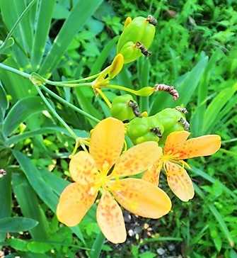 以前にも書いたが、この桧扇の種が「ぬばたま」で、黒、夜、髪、夢などの枕詞として使われる、和歌に頻出の詞である。一方花の方は歌に登場しない。可憐な花なのに不思議である。百合に比べると野暮ったい感じは否めないが、小生などはその野暮ったさも含めて百合よりも可愛いと言うか、好きである。万葉の素朴な歌には似合いの花だとも思うのだが、どうでしょう。