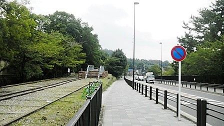 琵琶湖側と京都側とを疏水で行き来する船は、ここでトロッコのようなものに乗っかり、レールで運ばれて、疏水の流れる水面の高さと京都側の水路・運河の水面の高さとの高低差の問題を解決していたのですな。それをインクラインと呼ぶのだが、上及び下の写真はそのインクラインのレールである。今は水路によって人や物資を運ぶこともなくなり、廃止されて、遺跡展示物となっている。