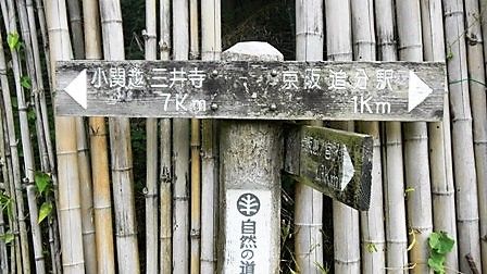 左に入って直ぐの処に道標があり、小関越・三井寺7kmとあった。この崖の上を国道161号線西大津バイパスが走っているのである。