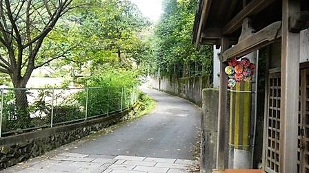 道の左側が普門寺というお寺。道の入口右側には地蔵堂。何やら有難い山道である。