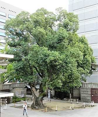 この木は、大阪空襲で焼け焦げて枯れる木が多くあった中で、ことなきを得て生き延びた木である。市内でも最古の木だそうで、保護樹木となっている。この木に触れると元気が貰えるということで、参拝の人が触って居られました。