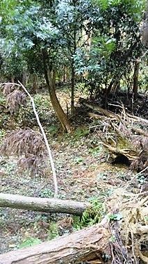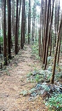 道は直ぐに山道となる。杉の林の中を行く。風に木々がざわめき、軋む音が頭上を走って行く。枝がぶつかり合って折れてもいるのか、時々パキッと乾いた音がする。やがて道であるのか何であるのか分らない様相になって来る。下の写真の如くである。