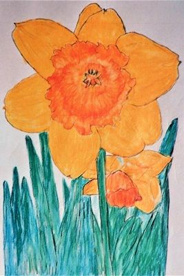 これは智麻呂邸のご近所さんの庭先に咲いていた喇叭水仙。ヤカモチが撮影してお持ちした写真から絵にされました。