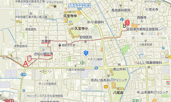 この後、顕証寺、念仏寺、大信寺と巡りますが、そのルートを示せば下掲地図の通りです。中央環状道路の神武町交差点から府道5号線をやって来ましたが、許麻神社から脇道を進みましたので、母校の八尾高校の前は通らずでした。八尾高校の東側を流れている川が長瀬川です。