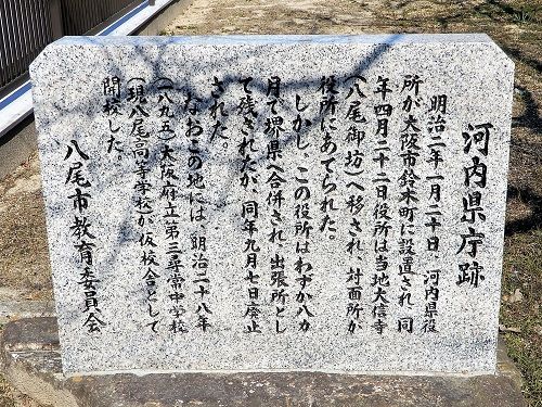 八尾高校発祥に関連する碑文などは無いものと思っていたが、河内県庁跡碑の説明のついでのような形であれ、これに言及したものが存在したことは何やら嬉しいことではありました。