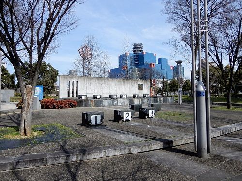 この公園には昔は扇町プールという名のプールがありました。その名残りを示さんと各コースのスタート台が公園入口にモニュメント兼椅子