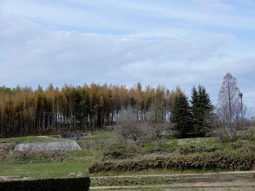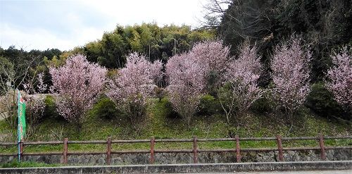 農園の南側は、桃の花か、早咲きの桜の花か、春爛漫の景色。