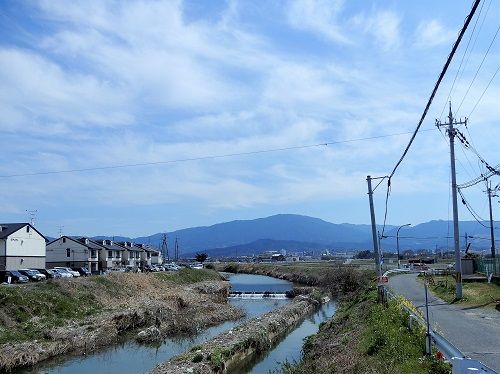 飛鳥川対岸の多駐輪場への橋の上から飛鳥川上流を見やると奥に畝傍山が見えて、なかなか良き眺め。