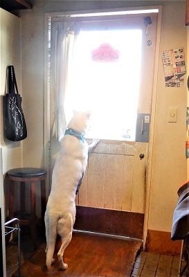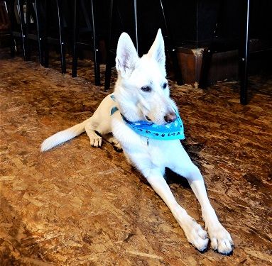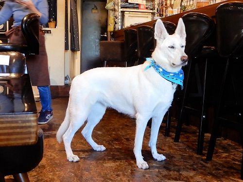 このワンちゃん。犬種はシェパードとのこと。白いシェパードであるから、当然、尾も白い。面白いのである。