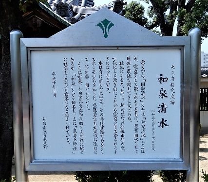 この社殿の裏手にあるのが、国府清水或は和泉清水と呼ばれる、大阪市指定史蹟の泉である。裏手には回らず、手前の説明碑を撮影したのみ。これも暑さの所為による注意力散漫という奴でしょう。
