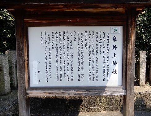神功皇后が三韓征伐(今はこのような言葉使いは不適切なのか「渡韓出兵」などと表記されている。)の折に、この地を通られると、この地に突如泉が湧き出たと伝えられて居り、泉井上神社の名も、和泉国の国名もこれに由来するという。