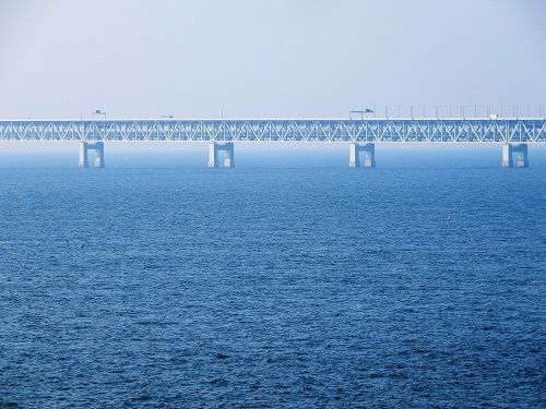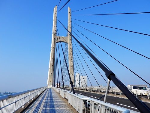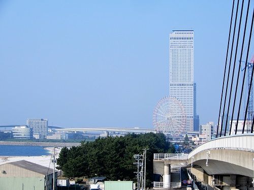 目を転ずると進行方向にはりんくうタウン駅のある高層ビルが聳えている。神社や墓や歌碑などを見て来た目には、海と近代的吊り橋と白い高層ビルの眺めは何か新鮮である。