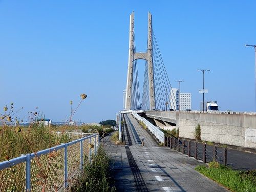 この辺りは田尻町。大阪人たるヤカモチであるが、大阪府内市町村の中に田尻町というのがあるとは知らなかった。目の前に現れた巨大な橋は田尻スカイブリッジ。田尻港の湾の上を通っている橋で両サイドに歩道もあって、歩いても渡れる橋である。夕日が美しいデートスポットとか書かれている記事を見たが、夕日が落ちるまで待っていては熱中症になるというもの。