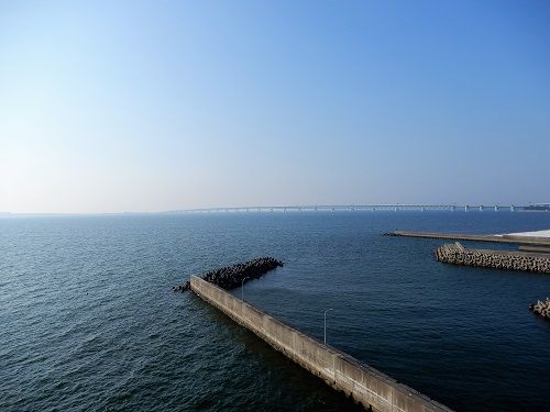 橋を上り切ると、関空大橋とその先にある関西国際空港が遠望され、海の青さと相俟って素晴らしい眺めである。手前眼下は田尻港の入江になるのだろう。