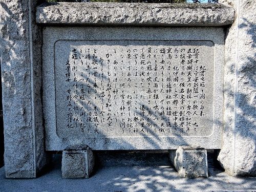 鳥居の右側、府道248号に沿った境内地に紀貫之冠之淵の碑がある。