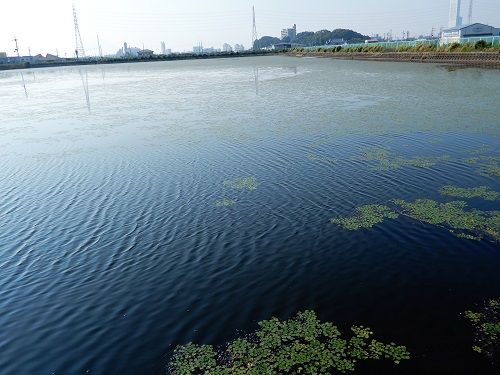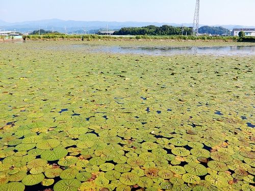右側(北側)の池は、菱だろうか。これも水面に繁茂している。